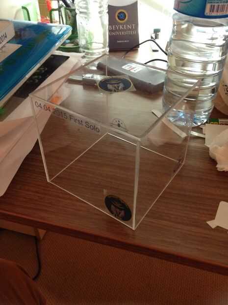 Preparar la jaula de protección de plexiglás. Es un cubo con lado de longitud de 14 cm. pégalo sobre el avión y su regalo está lista para su importante :)