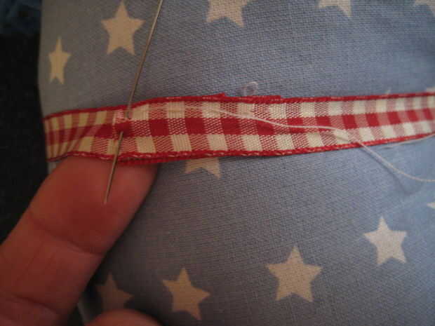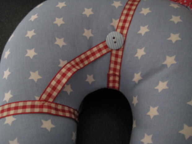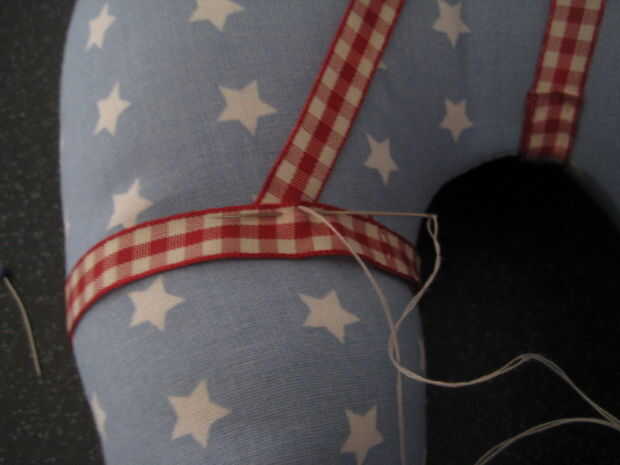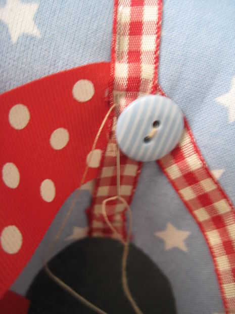 Medida alrededor de la nariz con un pedazo de cinta. Cosa en su lugar. Hacer lo mismo entre los ojos y oídos, entonces tome un pedazo de cinta desde la parte superior, uno en la parte inferior y coser en su lugar. Utilizar una cinta más gruesa para la manija y coser en su lugar, si utilizas cualquier botones recuerden personitas pueden sacarlos de coser tan super fuerte o mejor no utilizar si son menores de 4 años de edad.