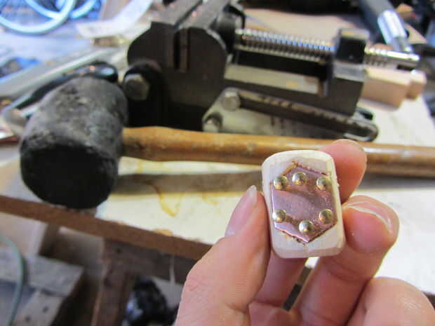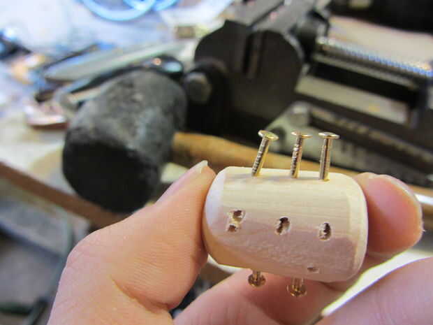 Este paso es bastante sencillo. Tome sus uñas, ponerlas en los agujeros que van a través del cobre y la madera y observan cuánto se está pegando hacia fuera. Luego, retirar, cortar la parte sobrante con tus tijeras o alicates y luego vuelva a colocarlas. Añadir algún buen pegamento de madera metal si son un poco flojos (utilicé algunos cemento duco y parece estar funcionando bastante bien).