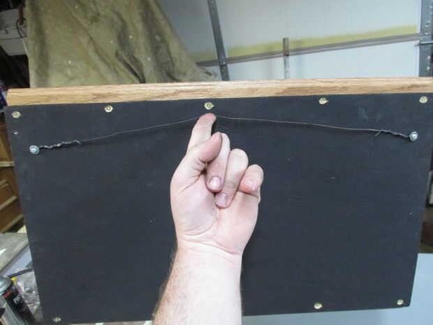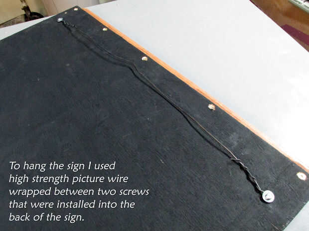 Hay muchas formas para colgar tu nuevo signo, simplemente utilicé alambre de imagen de alta resistencia envuelto entre dos tornillos que se instalaron en la parte posterior de la placa de soporte. Este método proporcionará una gran cantidad de fuerza y apoyo por lo que no debería haber ninguna preocupación de la señal de que se caiga al suelo.