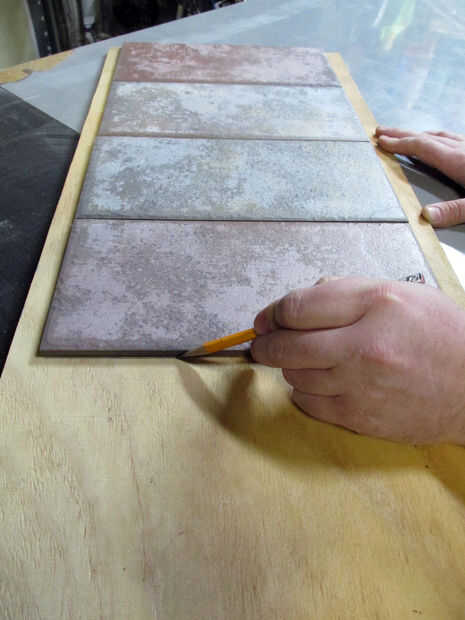 Paso uno de esta generación es crear la placa de soporte de madera que soporta las distintas partes de la muestra. Esta placa está hecha de madera contrachapada de 1/2" y varía en tamaño dependiendo del tamaño de los azulejos que tienes disponibles. La placa de soporte debe ser el mismo ancho que el ancho combinado de sus azulejos, es decir si tienes cuatro fichas y cada azulejo es 4" de ancho que entonces debe ser tu placa de soporte de 16" de ancho. En cuanto a la altura, la placa de soporte debe ser igual a la altura de tus azulejos más 1.5" para arriba y 1.5" para la parte inferior.