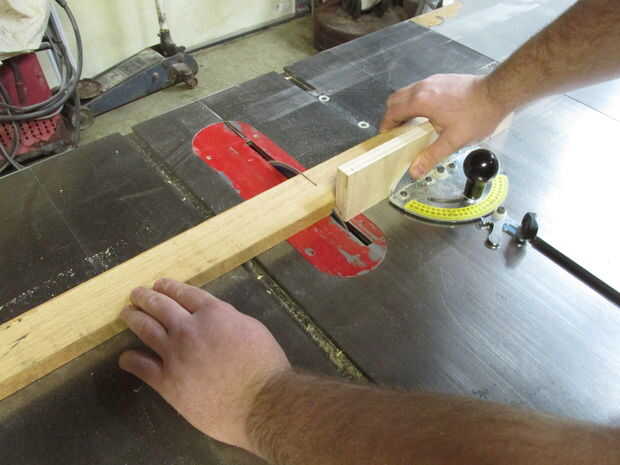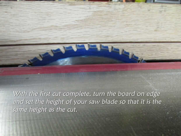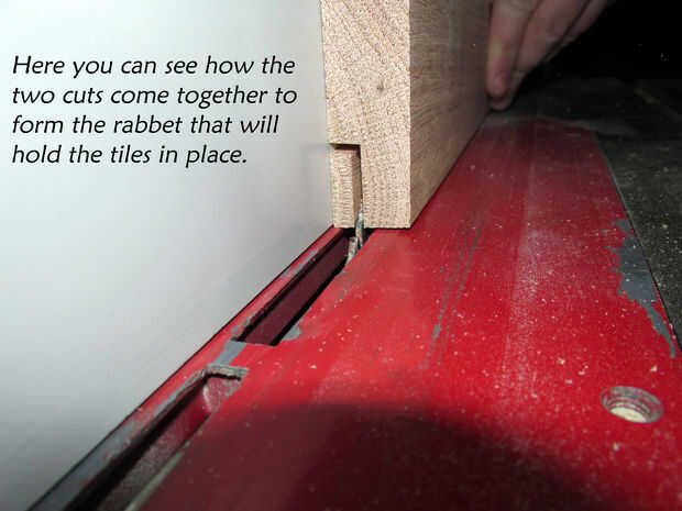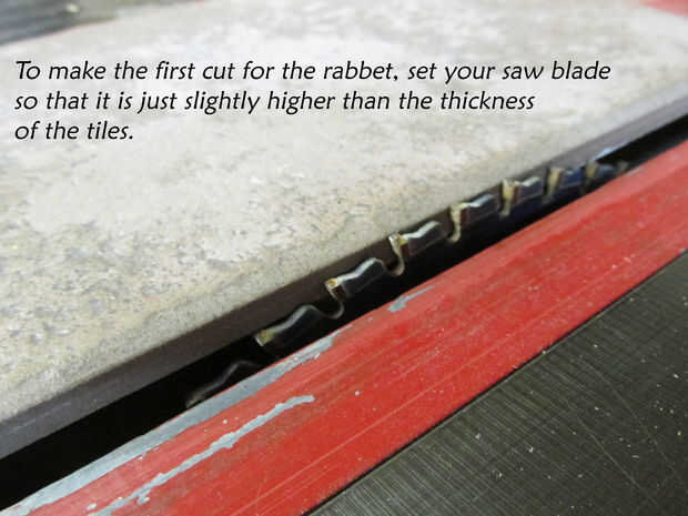 A continuación, fijar la altura de la hoja de sierra para que sea un poco mayor que el espesor de las baldosas y ajustar el tope-guía para cortar al aproximadamente 1" de la hoja. Cuando todo está ajustado correctamente pase sus tablas sobre la hoja como se muestra en la imagen. Este corte va a crear la parte posterior de la barbilla.