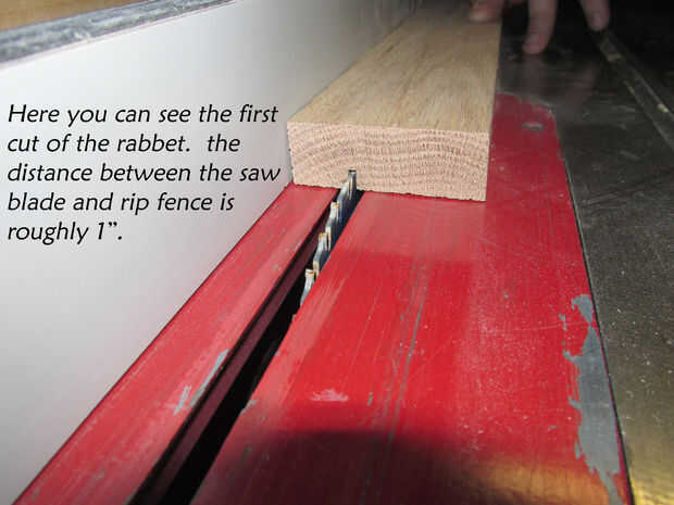 Después de hacer el primer corte en ambas tarjetas, elevar su altura de hoja de sierra a cerca de 1" y mueva el tope-guía para cortar que este corte será reunirse con el primer corte que ha realizado, (ver imagen). Una vez que todo se encuentra correctamente hacer los cortes para completar los rebajos.