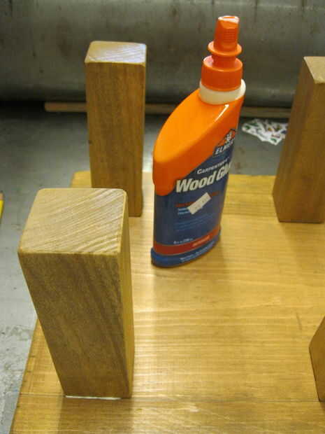 lugar marcadas de las patas en los cuatro de las esquinas del lado manchado de la madera y asegure con pegamento de madera. Con pegamento de madera ayuda a mantener las piernas en su lugar para prepararse para el siguiente paso.