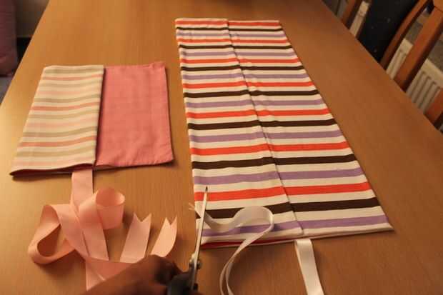 Doblar la mitad de 1 metro cintas de blanco/color de rosa en dos Inserte el medio de la cinta en el lado derecho de la bolsa donde se muestra la abertura y coser la costura, así como coser una puntada en la parte superior e inferior longitud sabio.