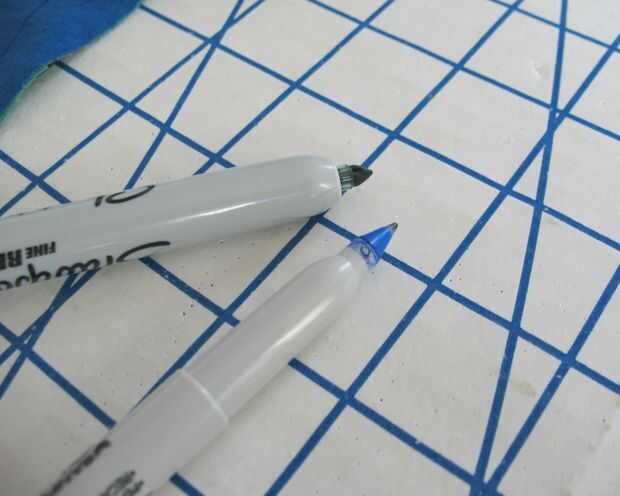 Decidí orientar el patrón a lo largo de la grainline de la tela. A partir de un extremo, había trazado cada recorte con mi pluma Sharpie. Esto fue muy rápido. El Pellon es lo suficientemente gruesa como para mantener la pluma en la pista y de fácil seguimiento.