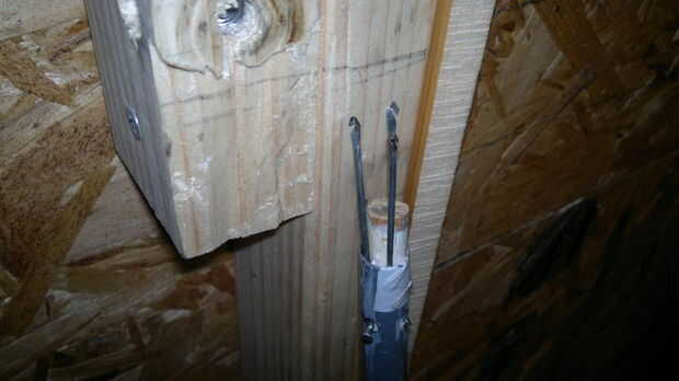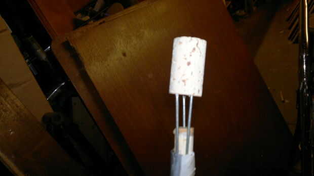 Sosteniendo el tubo con los agujeros hacia abajo introducir los radios interior con la 'boquilla' a través del agujero... Cortar un trozo de dowl (aprox. 1.5"(32mm)) lugar entre los radios y casa de martillo...