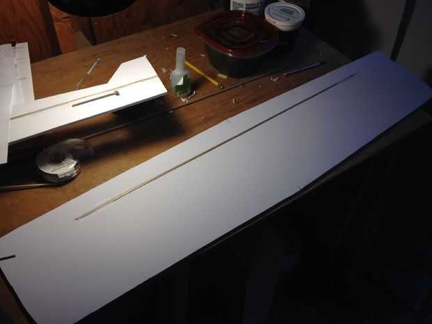 Será necesario cortar algunas piezas rectangulares de espuma como soporte adicional para el ala. Pegarlos en su lugar, otra vez tan uniformemente como sea posible. Desea que el ala sea perfectamente perpendicular al cuerpo.