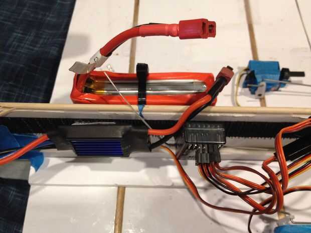 Posición específica de la batería será necesario ajustar. Objetivo para el centro de gravedad es 1/3 de la forma de la parte delantera del ala en la parte posterior. Quizá deba ajustar la posición tras el primer vuelo.