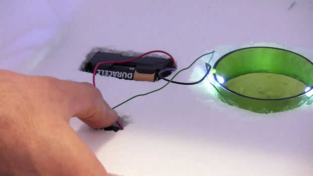 Dentro de la caja, talla un agujero para el soporte de la batería, interruptor y espacio para los diodos.