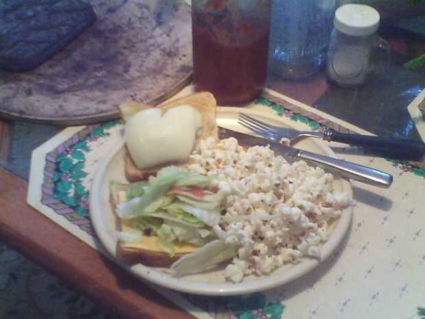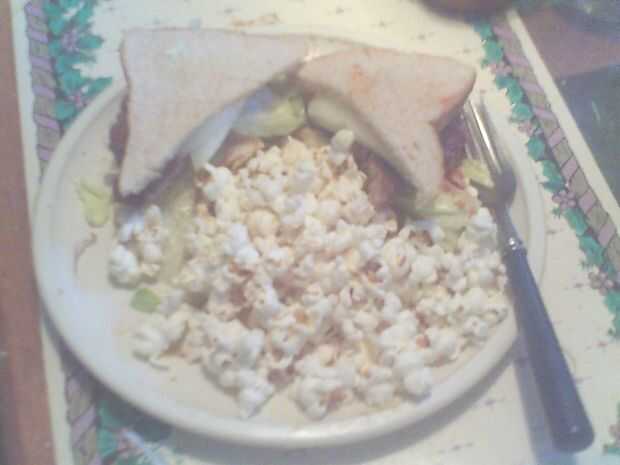 Uy, puse tantas palomitas de maíz no puede ver la hamburguesa grande.