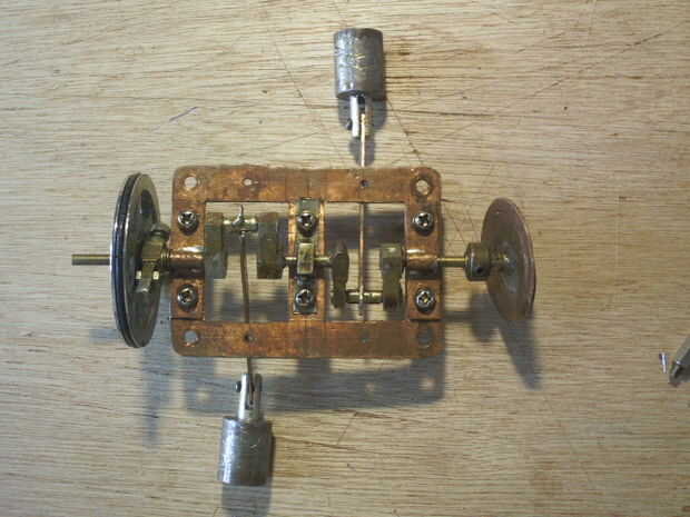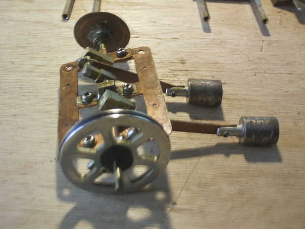 Los pistones se hicieron el peso de la pesca, en primer lugar utilicé el cilindro como el molde y vierte fundido plomo en, pero el plomo del encogimiento después de forma fresca abajo y no es bueno para el cilindro, así que encontré otro molde ligeramente más grande que el cilindro para derretir el plomo, luego presentar el pistón para caber justo, pero lamentablemente el tubo de cilindro no forma redonda. El cigüeñal dispuesto fase 180 grados, por lo que un pistón por el otro hacia abajo, sin embargo no auto Inicio necesidad darle un empuje. La válvula de admisión/escape fue medida por el plato distribuidor que se convirtió por el cigüeñal.