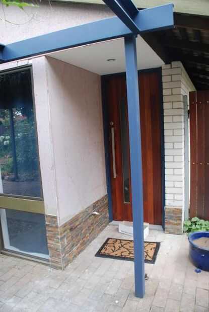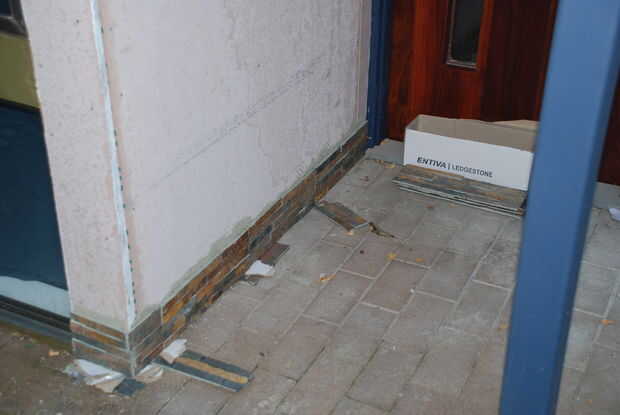 Una vez que la puerta estaba en me cubre el exterior de la entrada con una hoja de cemento y comenzó a poner el ledgestone.