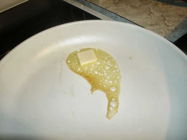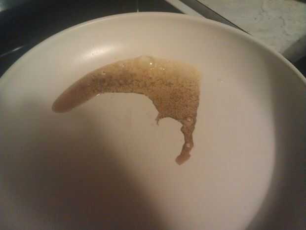 Ahora, tomar una almohadilla de la mantequilla y el lugar que en la misma sartén a la misma temperatura. (Imagen 2) Se puede ver que, incluso antes de que la mantequilla acabados de fusión, ya está empezando a quemar. Cuando la mantequilla se haya derretido completamente, las proteínas y azúcares han carbonizado significativamente (imagen 3).