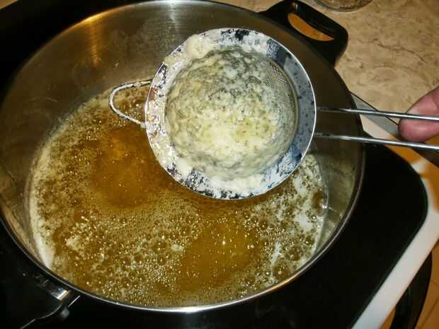 Utilizar un tamiz de malla fina para capa superior de la espuma que ha reunido en la parte superior. (Imagen 2) Mientras que esto no va a cambiar el sabor de la mantequilla de búfalo, hará mucho más fácil después del filtro y también le permitirá ver el fondo de la olla para que pueda ver cuando se termina el ghee.