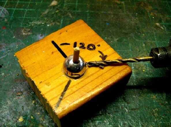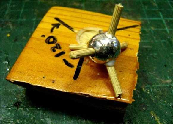 Luego se perforan los tres agujeros "ecuatoriales" en la bola siguiendo las marcas de ángulo 0120. Tres longitudes de 12 mm de pincho de bambú se pegan en estos hoyos para completar un centro del átomo de bipirámide trigonal.