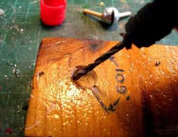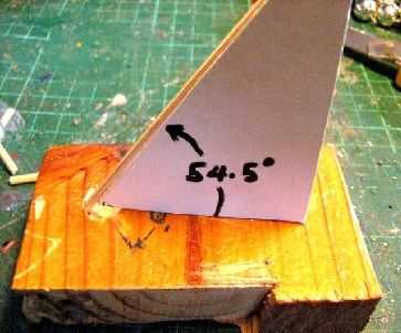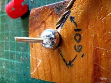 Ahora se perforan los orificios restantes de dos 109.5 0en consonancia con las marcas y dos más largos de 12 mm de pincho de bambú pegado en los agujeros. El resultado será un centro de átomo tetraédrico con cuatro bonos en ángulos de 109,5 0 estos son utilizados para hibridación sp3 átomos, como el átomo de carbono en metano. Centros de átomo para sp3 nitrógeno, oxígeno y azufre se pueden hacer en la misma plantilla, pero usando sólo el número de dientes. Prefiero dejar los dientes extras en su lugar para representar a pares solitarios de electrones (si procede).