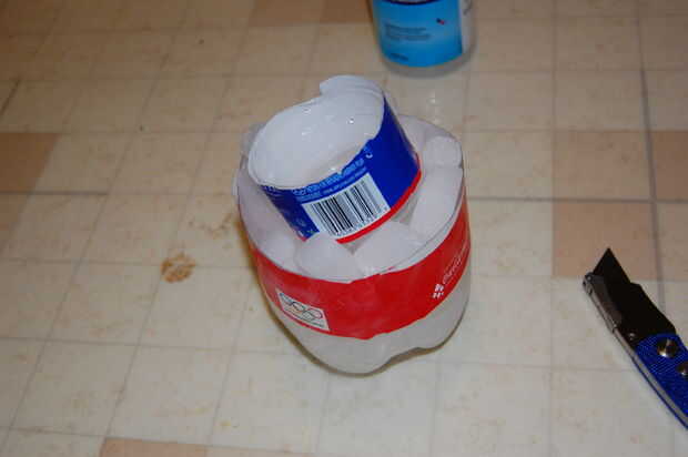 Poner algo de hielo seco en la parte inferior del recipiente, añadir la botella interna y rellene alrededor de los lados. He intentado sólo llenarlo y trabajar la botella, pero no funciona para nada. Triturar el hielo seco produce resultados uniformes más, a costa de sublimación más rápida. (convertir en vapor inútil)