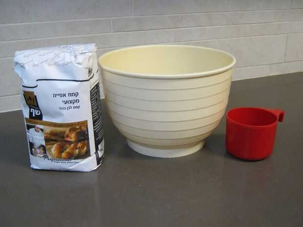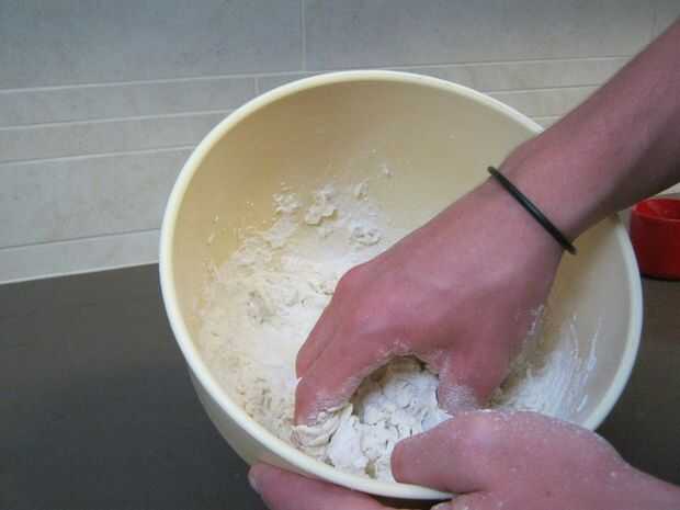 Tomar dos tazas de harina y vierta en un recipiente. Luego, añadir agua mientras mezcla (usando un brote podría ayudar a) hasta que la masa no es pegajosa pero permanece juntos. Cubra el tazón con una toalla y dejarlo. Calentar el horno a su temperatura máxima. (cantidad para 3