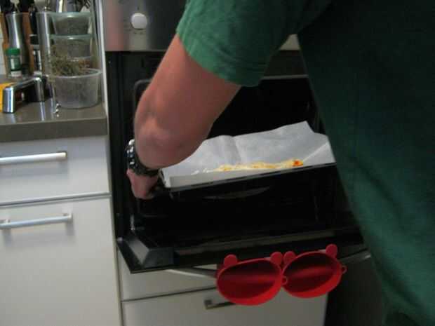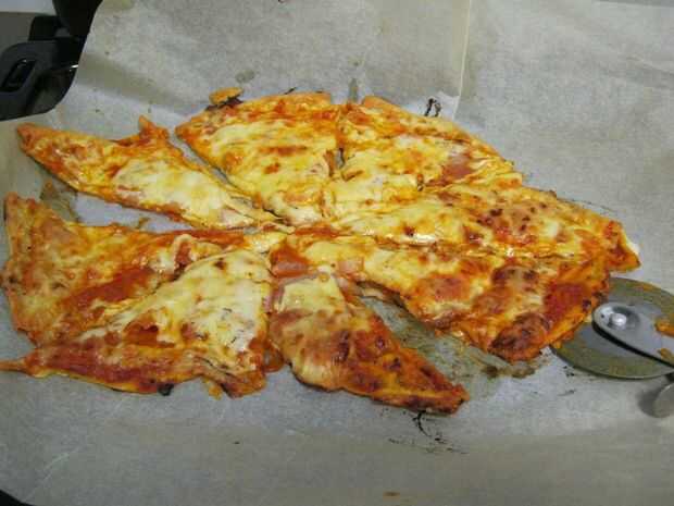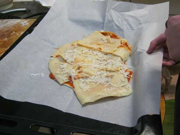 Cubrir una bandeja para hornear con papel de hornear, poner en la pizza e inserte a la repetición de horno con los dos otros.