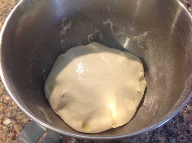 Cuando la masa está completamente amasada, liso y elástico sacar del recipiente. Limpie el recipiente y cubrir con una pequeña cantidad de aceite vegetal. Vuelva a colocar la masa en el recipiente y gírela alrededor para cubrir la masa con aceite.