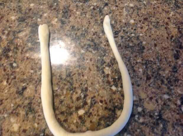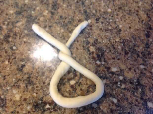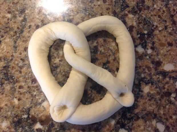Esta es la diversión paso! Participar los niños rodando, girando y formar la masa. En primer lugar, rodar cada bola en una cuerda de 24 pulgadas de largo. A continuación, recoger una de las cuerdas, sostenga en cada extremo y hacer una forma de "U". A continuación, tuerza los dos extremos en el centro de los lados de la "u". Llevar los extremos hacia la parte inferior de lo pretzel y péguelos a lo pretzel. Quizás tenga que arreglar un poco la masa para obtener la forma de pretzel perfecto! Coloque cada pretzel en una bandeja forrada con papel de pergamino con aceite o silicona para hornear mat.