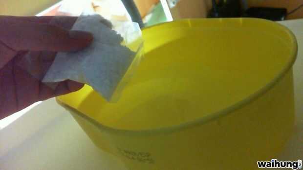 Mientras espera, preparé la solución de hidróxido de sodio solo agregando los cristales al agua. Solo poner una pequeña cantidad de ella.