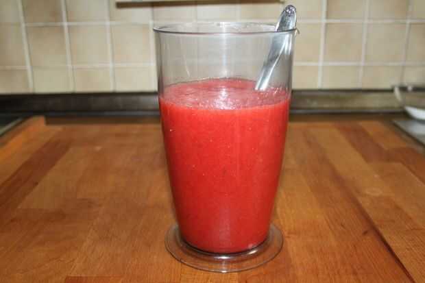 Lavar y cortar el straberries y hacer zumo con la liqudiser. Yo no agregue azúcar, así que su hasta usted para añadir azúcar o no. Mezclar el musgo chaina jugo líquido y fresa. Que hacer no es necesario colorante para esto. Verter en tazas de sandía, tirar semilla de tukmaria en la parte superior. Una vez que establece, cortarlas en rodajas.