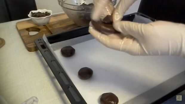 Ahora hacer su bola del tamaño deseado y aplane en su palma y añadir un trozo de chocolate en el medio y cerrar el fragmento en la masa. Mantenga las bolas de galletas en el plato de la hornada a buena distancia como va a propagarse cuando al horno.