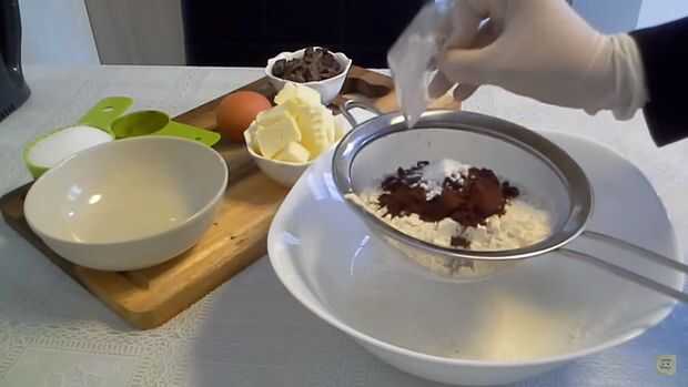 Tamizar en un bol harina, polvo de cacao, esencia de vainilla (la mitad) y polvo de hornear.