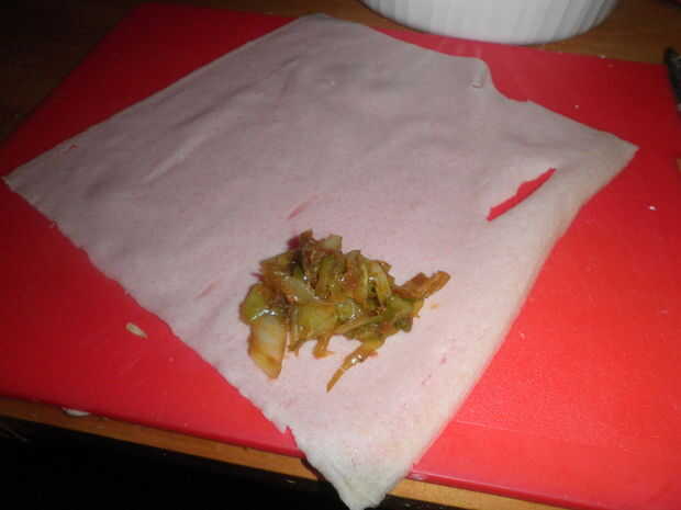 Haz 1 de sus envolturas de rollo de primavera y poner aproximadamente 1 cucharadita de la mezcla de col a él y doblar la envoltura hasta dos veces luego doble los lados y rodar casi a la parte superior y el extremo del palillo abajo con harina y agua, hacerlo con los otros 19.