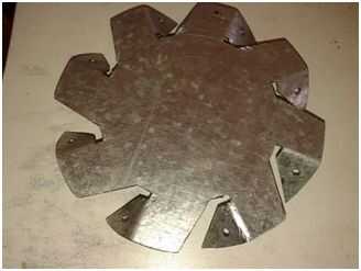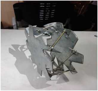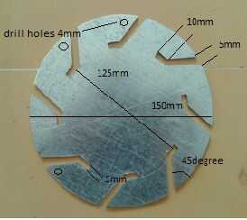 Utilizar cincel y martillo para cortar las porciones que no se puede cortar con máquina de corte. Uso de archivos para asegurarse de que su trabajo es limpio y ordenado. A continuación que tendrás que realizar agujeros de 4mm en el borde con la máquina del taladro de mano. Ahora con la ayuda de la mordaza de mesa doble los bordes del corte en ángulo de 45 grados. Una vez que han doblado los bordes su trabajo debería parecerse a algo como qué se muestra en la imagen. Cada rueda requiere un par de estos y por lo tanto cuatro ruedas ascenderá a ocho.