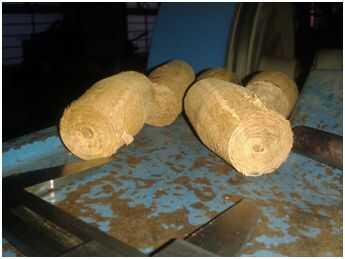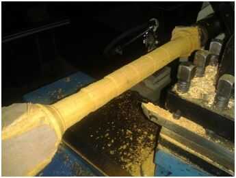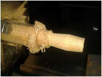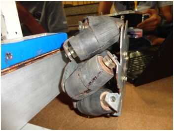 Una vez que esto se hace, es momento de hacer los rodillos. Tomar pedazos de madera y colocarlos en la máquina del torno. Hacer un rodillo de forma de barril de 5cm de longitud con 4cm de ancho en el centro y 3cm de ancho en los bordes como se muestra en la figura. Cortar las piezas con Sierra de mano y use papel de lija para limpiar los bordes ásperos. Cada rueda necesita ocho rodillos y por lo tanto un total de 32 para cuatro ruedas. Pack ciclo tubo sobre los rodillos de forma de barril a maximizar el agarre. Estos rodillos tienen lugar entre dos metales que nos doblados a 45 grados con las tuercas y los pernos. Los espaciadores se utilizan entonces si los rodillos están flojos. A continuación disponen de los motores en las ruedas usando los ejes.
