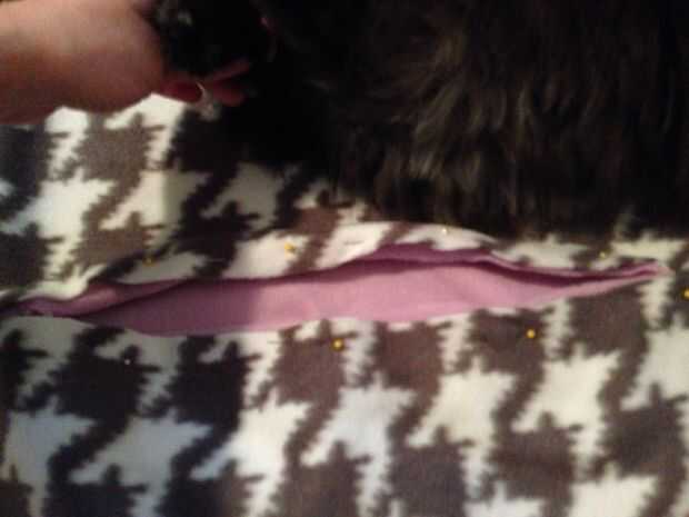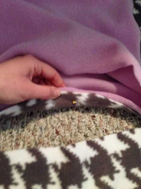Me gusta hacerlo girando la manga derecha hacia fuera, colóquela sobre el lado derecho de la manta y alinear la parte superior de la manga con la parte superior de la ranura. Pellizcar las capas de tela para que los lados del derecho juntos y pegar un pin en la parte posterior. Ahora voltea la manta y la misma manera todo alrededor del borde del perno.