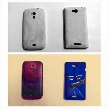 Cubierta de teléfono celular, paño de algodón, pegamento, tijeras, colores acrílicos y pincel.