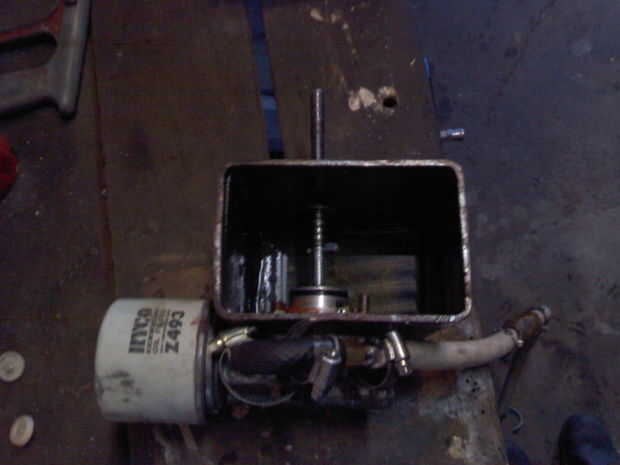 Lo primero que hice fue hacer una bomba de aceite. Para hacerlo utilicé algunos tubos en forma de rectángulo, placas de hierro, manguera, soldadura de barras y una bomba de aceite de una Subaru Ute. Soldado con autógena la pipa a una de las placas, luego perforar un agujero para la bomba de aceite encajar en (hubiera sido más fácil utilizar un oxy). A continuación tenía que poner en el eje para conducir la bomba de aceite (Asegúrese de que el eje esté recta). Entonces tuve que sellar la tubería de pvc tubería cemento.