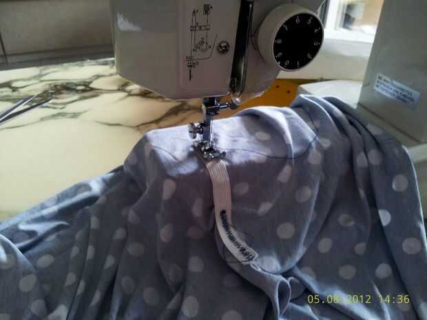 ¡ IMPORTANTE! La banda elástica debe ser completamente extendida, cuando mueve, debe tomar un poco el tejido al mismo tiempo con él. De coser ambos juntos.