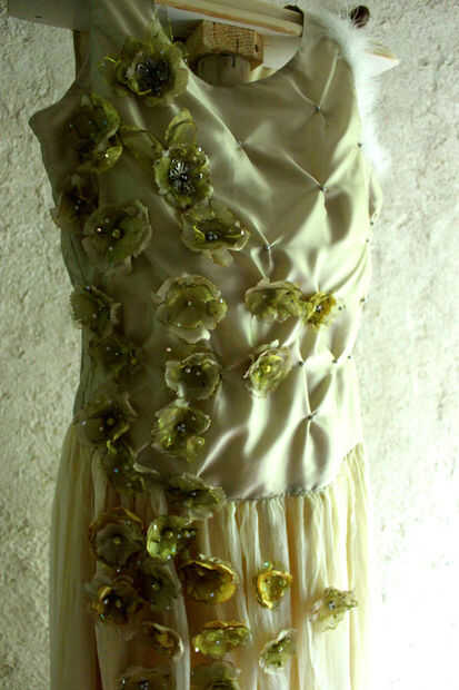El mayor desembolso para este vestido es tiempo, que es el trabajo (y diversión) implicados en su creación. También obviamente mano-se cosen las piezas, aunque la principal las costuras de la blusa y la falda del vestido, además de la puesta en de la cremallera todos se realizaron en una máquina de coser. El material que utilicé fue bajo forro de tela y lo que podría ser clasificado como tul y organza barata pero muy alegre. Por lo tanto, mucho brillo y poca sustancia sólida pero irónicamente las secciones decoradas apliques de este vestido no se pueden hacer con otra cosa que tejidos artificiales, de peso ligero. También estoy usando la técnica de manipulación de la tela a una tela de forro muy ordinario en algo más rico y con textura. Me gustó la mirada tenue del conjunto final, tenía una calidad etérea que para una ocasión especial, debe ser mágico.