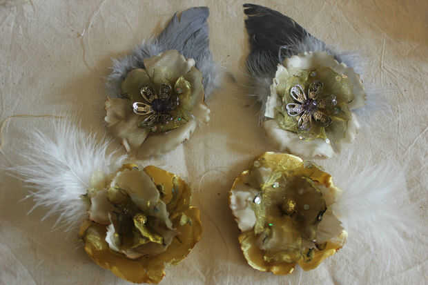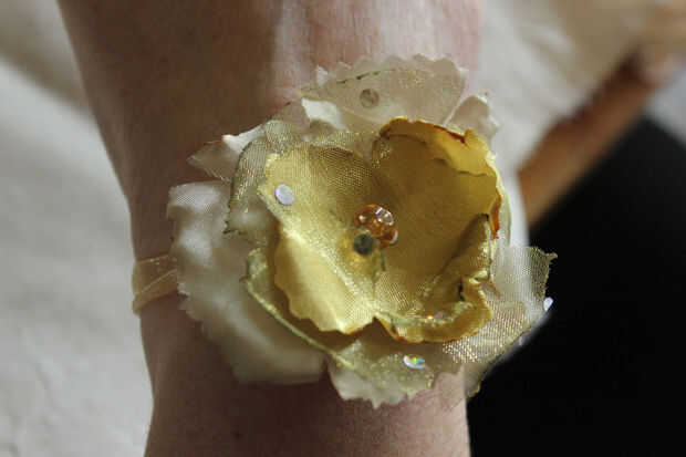 Los clips del zapato se basan en pares de 'alas de Ángel' que compré en el último día de bonanza de la decoración de Navidad de venta y dos plumas de 'swan' más de una guirnalda. Hice dos conjuntos, uno para Elsa y para la reina hada. Simplemente añadí una flor de tela a cada uno y fueron cosidos a zapatos de ballet en Escocia. Las flores también fueron utilizadas para hacer pulseras de la cinta simple, había visto por primera vez en Francia muchos años atrás en la boda de un amigo donde ella tenía en la pesada seda de su vestido de novia. Ella me dio uno a usar más adelante en mi boda como mi 'algo prestado'.