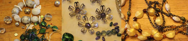 También usé un remanente de piel falsa, que había dejado de hacer un sombrero, para crear la banda de falso armiño de la tiara y un surtido de pulseras y collares rotos (todos sobre todo moderna bisutería cristal y plástico). Había recuperado botones y cuentas de una difunta correa moldeada de Rebeca, una cadena y un grano y una blusa de horribles finales años 50. Sin embargo, por el momento que están rediseñados, debe por lo menos parecen cristal, si no absolutamente semipreciosas! Particularmente me ha gustado estos metal Casquillas y cascarillas, que abría para hacer los centros de mis flores.