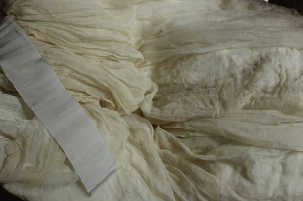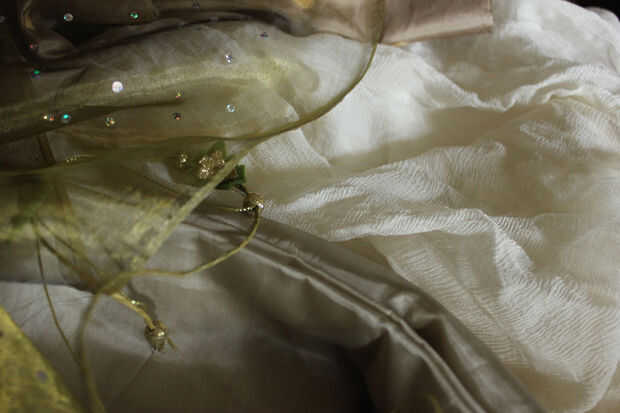 Para darle una idea de la tela, para este vestido, que fue hecha para un tamaño de 6/8 Reino Unido, (nosotros 4/6), compré 3 metros de forro de tela de 150cm (60") de ancho y medio metro de organza para hacer la tela de flores, además de medio metro de oro metálico 'araña' tul para el abrigo. En el momento en que terminé fue casi nada izquierda. En general para un vestido largo se necesita suficiente gasa para ir dos veces por sí mismo. Esto para permitir una falda que se recoge en la cintura y no se ve como si usted escatima en la tela. Si el gasa se vendieron en definitiva anchos, como será el caso para el material de la bufanda de sari, luego puedes hacer como yo hice y hacer 2 capas de tela. También quería la tela de la guarnición de oro rico de la falda para mostrar a través de cuando se fue la luz en él, haciendo lo que era esencialmente una muy moderna y artificial busca tela en algo más sutil e interesante. El vestido por encima de la izquierda, redecoró de un vestido de seda bordado que había hecho y gastado yo en una boda. Era un estilo georgiano, bien vestido y equipado con el estonio influenciado hada Reina