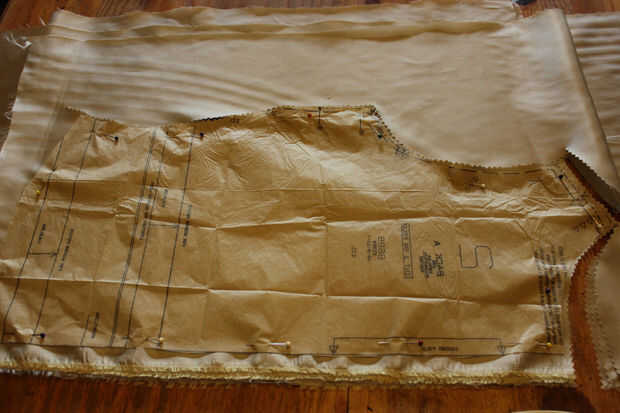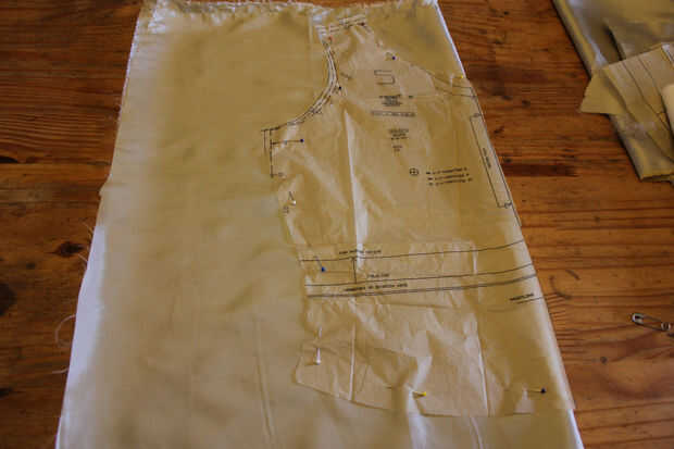 Con los lados del derecho juntos, doble a la tela de forro en dos, longitudinalmente. Pin el patrón para el frente de la blusa a la tela con la línea central de la blusa para el doblez del centro de la tela y cortar, preferentemente utilizando tijeras dentadas como este desgaste de la tela.