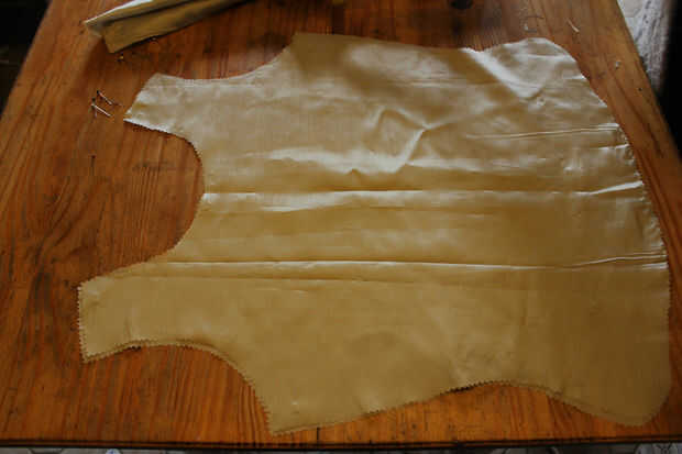 Apartar suficiente tela para cortar que se utilizará como insertos entre el frente y la parte posterior de su cuerpo, esto le permitirá hacer una blusa de corsé en forma de estilo ballet. También permite la pérdida de anchura en la manipulación de la tela. Debe dejar a suficiente tela para dos piezas rectas en cada medición de doble longitud de las costuras laterales de la blusa y de una anchura de unos 10cm (4"). Estos deben ser doblado longitudinalmente en dos y cosida a lo largo de una costura corta y la costura más larga y luego resultaron derecho contra derecho. Esto entonces ser doblado encima y hecho más angosta o ancha para crear la blusa cabida. Si nos fijamos en la foto de esta pieza hasta usted conseguirá la idea.