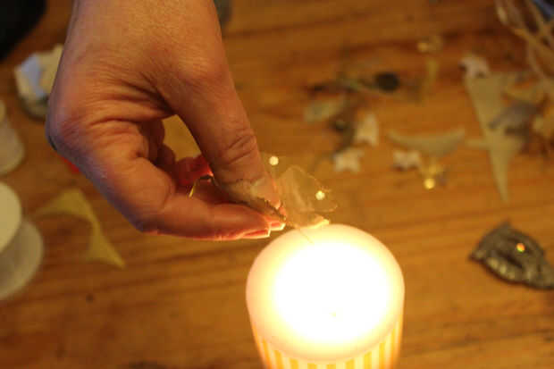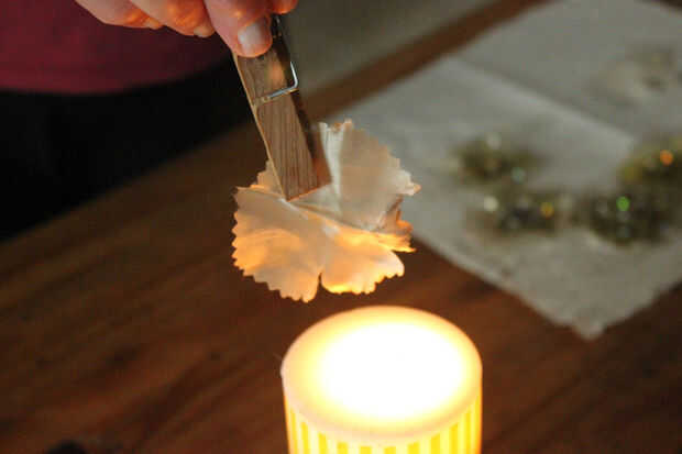 Esta es la parte inteligente, utilizando una vela celebra ahora los bordes de la tela cerca el calor de la llama para un momento y rotaba los círculos para conseguir un calor uniforme. Si usted está preocupado acerca de esto se puede mantener el círculo de tela con una clavija de ropa de madera o un par de pinzas de metal y obviamente necesita ser cauteloso al utilizar una llama desnuda, así que eliminar todos otros materiales inflamables en las cercanías. También tuve un tazón de agua fría cerca a mano en caso de conflagración. Por ello, la tela debe ser artificial, el calor funde el material y hace que los 'pétalos' enrollamiento hacia el interior de una manera muy agradable. También dejé algunas de mis pétalos al calor para ya, esto realmente les dio un cambio de color, que encontré un bono!
