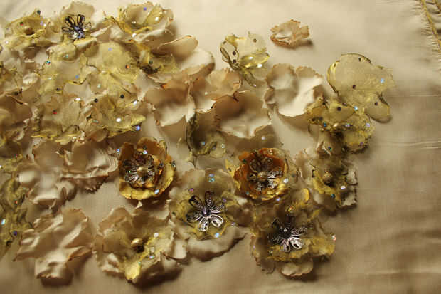 Lo planeado toda una serie de flores a la vez, elección de centros y combinaciones de colores. Esto me permitió hacer diferencias sutiles en la sombra en todo el vestido. También es útil para prepararse todas las perlas y joyas, para que una vez que estés inspirado todo lo tengas a mano.