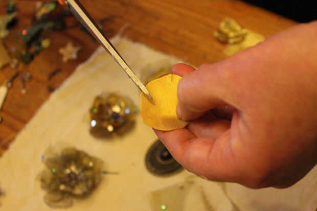 Luego cortada hacia adentro a través de la tela vagamente hacia el centro de la 'flor', de cinco puntos bastante equidistantes en la circunferencia del círculo, de esta manera crear cinco pétalos separados y no simétricas. Cuanto más el corte, más su pétalo se enrollamiento hacia adentro, así que como quería varias capas de pétalos en cada flor, varía la longitud de mi corte en cada círculo. Sin embargo, no hay problema con ser precisa sobre esto, naturaleza no es después de todo y los 'errores' pueden ser ocultados por otra capa de pétalos.