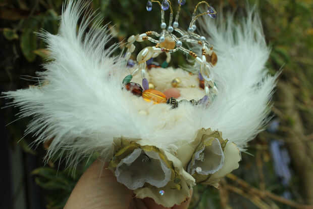 Pensé que debería hacer algo a lo largo de la línea de una corona real, con banda de imitación armiño y mitad-arcos de las 'joyas' construidas sobre un anillo de abalorios y separadores más grandes. También quería continuar mi inspiración original del cisne y el ballet y crear algo delicado de filigrana en la naturaleza.