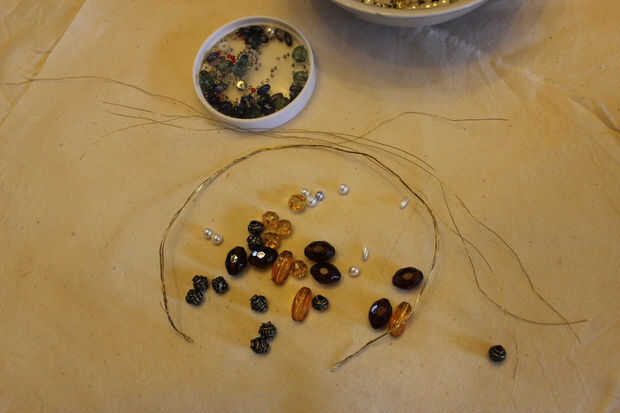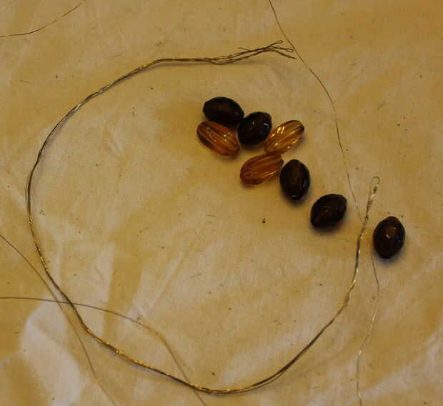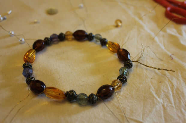 Fue creado el anillo de seis hebras de alambre para hacer una buena banda fuerte, comprueba para asegurarse de que todos los granos se rosca a través de este. También había verificado que los cinco granos ambarinos, que formó la base de cada arco medio, podrían ser enhebrados con un filamento adicional de alambre de. He trabajado cuánto alambre necesitaría hacer los arcos de media y en la preparación, cinco longitudes de grueso único en todos hacia fuera.