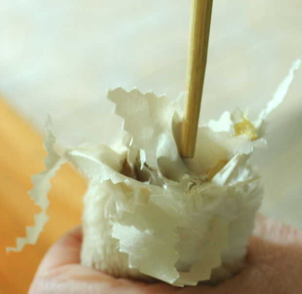 Usando un palillo de madera práctico, rellena este tubo con todos los pedacitos de tela que me quedaba de mis flores de tela.