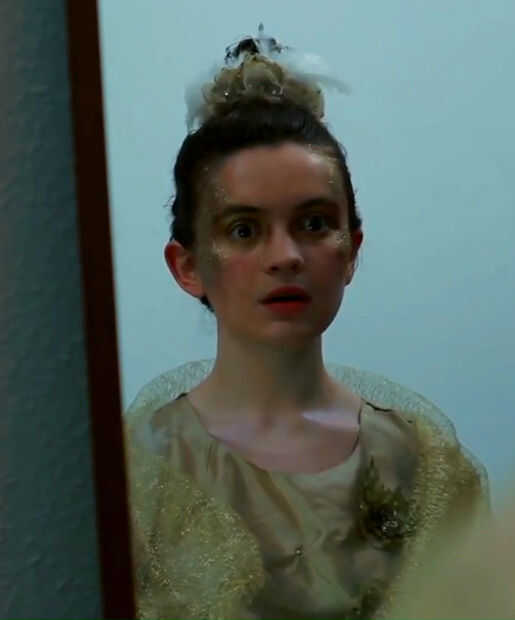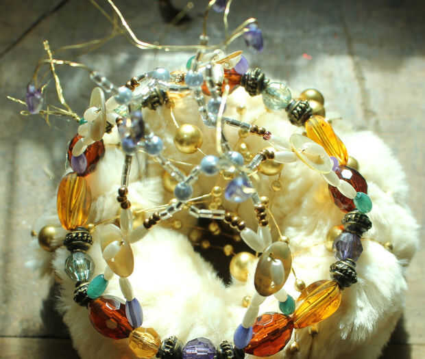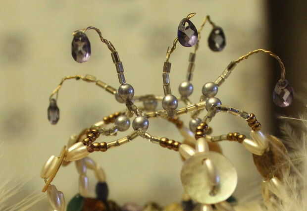 Acabé de la parte superior de la tiara con mi granos de gota de lágrima, torciendo el alambre que sostuvieron cada uno de estos granos en un lazo grande para permitir el movimiento. Entonces estaba lista para coser el círculo a la banda 'armiño'. Esto entonces fue adornado con dos flores de tela y plumas de cisne imitación dos de una guirnalda de la Navidad.